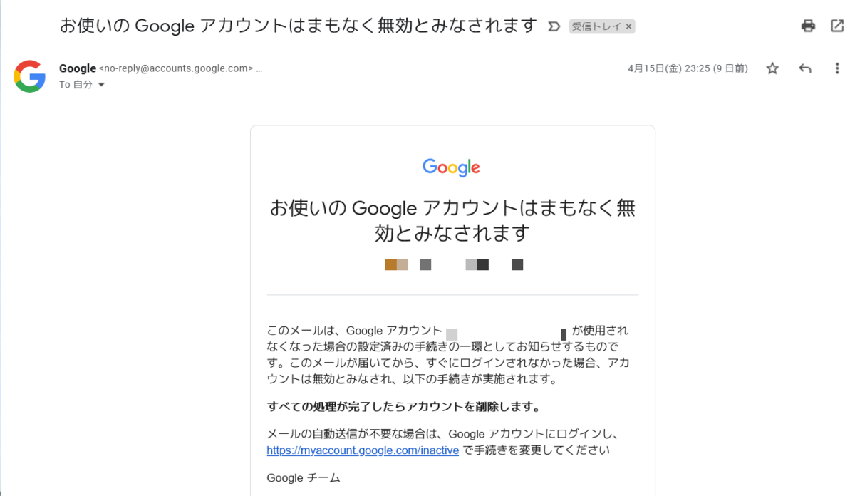 このメールは、Google アカウントが使用されなくなった場合の設定済みの手続きの一環としてお知ら