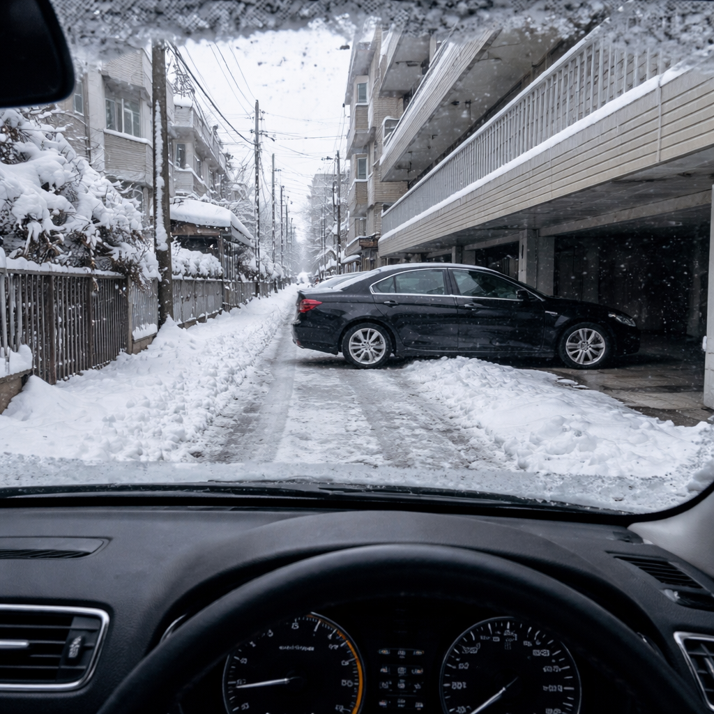 駐車場、適度に雪かきされてたので埋まることはないだろと思ったんだけど、道路に雪が積もりすぎていて駐車場との高低差が激しく、タイヤの力が路面に伝わりにくくなってしまったのが原因。